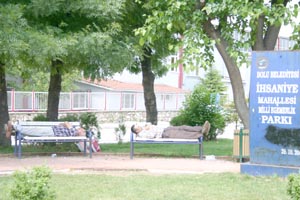 Dün öğle saatlerin İhsaniye mahallesinde bulunan Milli Egemenlik Parkında ilginç görüntüler yaşandı. İki işçi olanca Kalabalığa aldırış etmeden parkta bulunan bankların üzerine uzanarak horultulu bir şekilde uyumaya başladı.