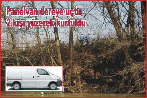 Sakarya'nın Akyazı ilçesinde köprü bariyerlerini aşarak Mudurnu Deresi'ne düşen panelvandaki iki kişi, yüzerek kurtuldu. Araç suya gömüldü.
