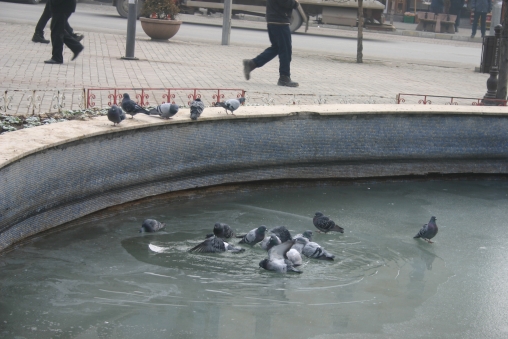 Güvercinlerin, havuz içersindeki kırık bölümün içindeki suyla banyo yapan güvercinleri vatandaşlar ilgiyle izlerken, havanın eksi 5 derecede olması ve güvercinlerin bu soğuk havada yıkanması büyük ilgi çekti. Güvercinler, kendilerini seyreden vatandaşlara aldırış etmeden, birbirleriyle oynayıp, soğuk suyun içinde yıkanması büyük ilgi çekti.