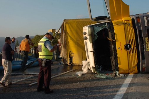 Kaza, önceki gün 18.30 sıralarında, D-100 Karayolu Bolu Dağı geçişinin Bakacak mevkiinde meydana geldi. Ankara'dan İstanbul istikametine giden olan 43 yaşındaki Selahattin Hancı'nın kullandığı 1H07 424 yabancı plakalı oksijen tüpü yüklü TIR, sürücüsünün virajda direksiyon hakimiyetini kaybetmesi sonucu bariyerlere çarparak devrildi. TIR'ın dorsesinden çevreye yayılan oksijen tüpleri sızıntı yaparken, onlarca tüp uçurumdan yuvarlandı. Kaza nedeniyle D-100 Karayolu'nun İstanbul istikameti ulaşıma kapatıldı. Trafik ekipleri, İstanbul istikametine giden araçları Elmalık kavşağından TEM Otoyolu'na yönlendirdi. Yolda kalan araçlar ise trafiğe kapalı yolda ilerledikten sonra kavşaktan çıkıp TEM Otoyolu'na yöneldi.