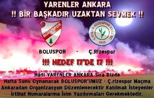 Boluspor içerde dışarıda destekleyen aktif bir taraftar grubu olan Ankaralı Yarenler yarın Bolu’da oynanacak olan Ç.Rizespor maçına da otobüs kaldıracak. Organizasyonda yer almak isteyen taraftarların, Selçuk Dursun ya da Savaş Akca’ya ulaşmaları gerekiyor.