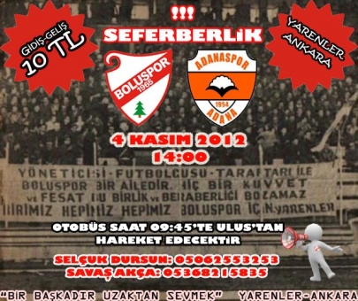 Ankaralı Yarenler taraftar grubunun sosyal paylaşım sitesinde yaptığı açıklamaya göre her hafta olduğu gibi Boluspor-Adanaspor karşılaşmasına Ankara'dan organizasyon gerçekleşecek. Otobüsün maç günü saat 09.45'de Ulus Atatürk Spor Salonu önünden kalkacağı öğrenildi. Alınan bilgiye göre Bolu’ya kalkacak otobüslerde yer almak isteyen taraftarlar geliş-gidiş için yalnızca 10 TL. ödeyerek maçın heyecanına ortak olabilecekler. Otobüs organizasyonu için Savaş Akça (0 536 8215835) ve Selçuk Dursun’a (0 536 821 58 35) ulaşılması gerekiyor. Konuyla ilgili olarak Ankaralı Yarenler tarafından yapılan kısa açıklamada, “Arma uğruna yollardayız. Bir başkadır uzaktan sevmek” ifadelerine yer verildi.