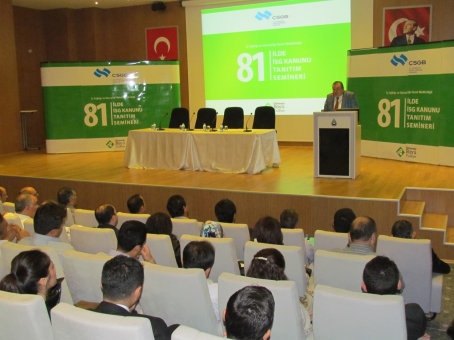 Toplantının ilk bölümünde Çalışma ve Sosyal Güvenlik Bakanlığı İş Sağlığı ve Genel Müdürlüğü Uzman Yardımcısı Kürşat İsmail Akça, 6331 Sayılı İş Sağlığı ve Güvenliği Kanunu’nun sektörlere getirdiği düzenlemeler hakkında detaylı bilgiler verdi. Toplantıya katılanlara iş sağlığı ve güvenliği ile ilgili bilgi materyallerden oluşan kitler dağıtılırken, oturumun ikinci kısmında Çalışma ve Sosyal Güvenlik Bakanlığı İş Sağlığı ve Genel Müdürlüğü yetkilisi Mühendis Coşkun Demirci, iş sağlığı ve güvenliği kültürünün işyerlerinde yaygınlaştırılmasının gerek yasal, gerekse uygulamadan gelen zorunlulukları ile ilgili bir sunum gerçekleştirdi.