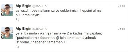 Tweetter hesabında kendisiyle birlikte Ali Güzeldal ve İskender ile ilgili iddiaları yanıtlayan Alp Ergin şunları yazdı: “Yerel basında çıkan şahsıma 2 arkadaşıma yapılan, “Peşinatlarını almadıkları için ayrılmak istiyorlar” haberleri tamamen asılsızdır. Peşinatlarımızın ve çeklerimizin hepsini almış bulunmaktayız.”