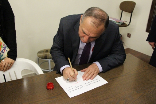 Sergiyi gezen Başkan Yılmaz daha sonra Tezhip kursu öğrencilerini ziyaret etti. Kursiyerlerin isteği üzerine ilk defa hat yazısı denemesi yapan Yılmaz’ın yazısı herkes tarafından beğenildi.