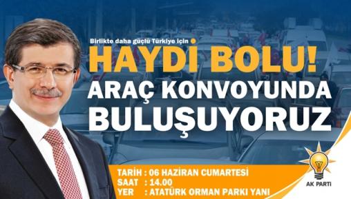 6 Haziran Cumartesi günü saat 14.00'de Atatürk Orman Parkı’nın önünden başlayarak belirlenen güzergahta devam edecek olan konvoya yoğun katılım olması bekleniyor. Gerçekleşecek araç konvoyu ile ilgili bilgiler veren AK Parti Bolu İl Başkanı Yüksel Coşkunyürek, 7 Haziran'ın Türkiye'nin bir dönüm noktası olduğunu belirterek, "Bu seçimler ülkemiz ve milletimiz için dönüm noktası. Bizler Kurucu Genel Başkanımız, halkın oyları ile seçilen ilk Cumhurbaşkanımız Sayın Recep Tayyip Erdoğan ile Genel Başkanımız ve Başbakanımız Sayın Ahmet Davutoğlu önderliğindeki Ak Parti'nin, milletimizin desteği ile bu seçimden de zaferle ayrılacağına şüphemiz yok. Yaklaşık 4 ay önce başladığımız ve büyük özveri ile sürdürdüğümüz seçim çalışmalarımıza 6 Haziran Cumartesi günü saat 14.00'de il teşkilatınca yapacağımız konvoyu ile son veriyoruz. Konvoyumuzun buluşma noktası Atatürk Orman Parkı yanı olacak ve buradan hareket ederek, öncesinde belirlediğimiz güzergah boyunca devam edecektir" dedi.