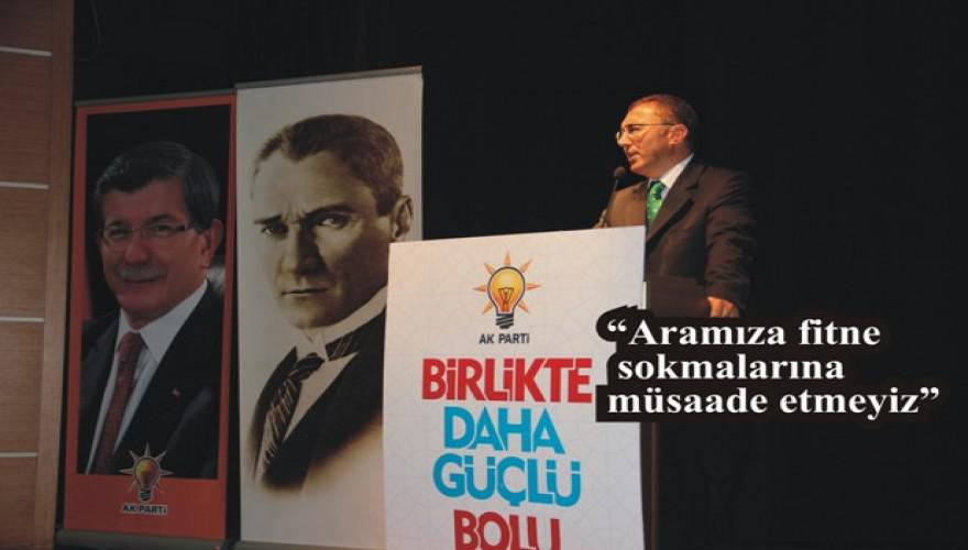“Son bir yıldır yaptığımız çalışmalar dolayısıyla Sayın Başbakanımızdan ulusal konuşmalarında Bolu teşkilatları olarak teşekkür aldık. Teşkilat çalışmalarımıza tüm ilçelerimizde ve ilimizde önemli ivme kazandırdık. Periyodik toplantılarımız bütün teşkilatlarımızın yoğun katılımlarıyla gerçekleşti, İlçe Danışma Meclisi Toplantılarımız uzun bir aradan sonra yeniden yapılmaya başlandı. İl Danışma Meclisi Toplantılarımız her ay yoğun katılımlı ve yoğun gündemli gerçekleşiyor. Tüm teşkilatlarımız birbirleriyle ahenk içerisinde çalışması ile Cumhurbaşkanlığı seçiminde yüzde 66,13 oy oranı ile Türkiye’de 22’nci olduk. 7 Haziran seçiminde yüzde 53,13 ile Türkiye’de 26’ncı olduk ve Teşkilat Performans çalışmalarına göre Türkiye 21’ncisi olduk, Genel Merkezimiz tarafından teşekkür aldık. Tabii ki söylemeden geçemeyeceğim: Bolu siyaset tarihinde ilk defa 5 bin kişinin katıldığı il kongresini gerçekleştirdik. Ve yine bir ilke imza atarak 23 bin kişinin katıldığı bir miting gerçekleştirdik. Bu çalışmalar korku saldı, birilerini rahatsız etti. Bilsinler ki, onları rahatsız etmeye devam edeceğiz. Aşkla, heyecanla, samimiyetle, inançla çalışarak yeni başarılara birlikte imza atacağız. Bu başarılar hepimizin, her birinizden Allah razı olsun.”