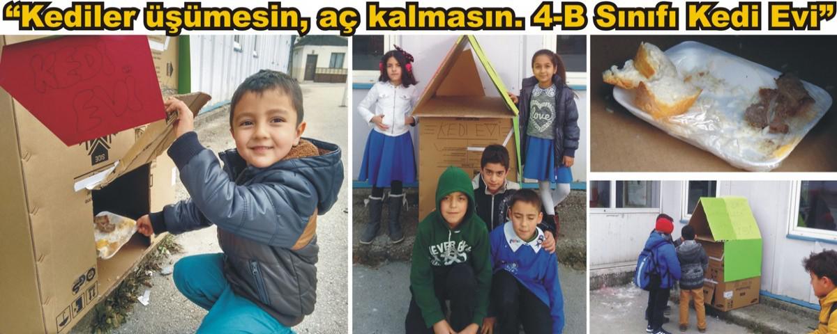 Kış aylarında hava sıcaklıklarının eksi derecelere kadar düştüğü Bolu’da sokak hayvanları da soğuktan etkilenmeye başladı. Atatürk İlkokulu’nda eğitim gören 4. sınıf öğrencisi üç arkadaş Toprak Kayra Öztürk, Eren Özyıldız ve Mertcan Güneş ise sokak kedileri için okulun bahçesine kartonlardan kedi evi yaptı. Soğukta kalan kedilerin geceleri kartona girip ısınabileceğini düşünen üç öğrencinin bu çalışması herkesin beğenisini kazandı. Öğrenciler, kedi evinin içine ekmek ve et de koydu. Kartonun üzerine ise “Kediler üşümesin, aç kalmasın. 4-B Sınıfı Kedi Evi” yazıldı.