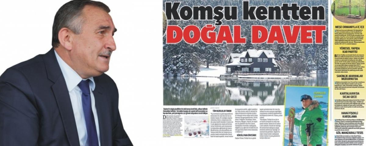 Yedigöller, Abant, Gölcük, Seben Gölü ve yaylaları, Kartalkaya Kayak Merkezi, termal kaplıcaları ile dört mevsimin ayrı güzellikte yaşandığı Bolu’dan Başkentlilere davet… Hürriyet Ankara Bölge ekinde yayınlanan haberde, misafirlerine termalden kayağa kadar çok sayıda tatil seçeneği sunan Bolu’nun, doğasıyla eğlencesiyle unutulmaz bir yılbaşı tatili için cazip bir alternatif olduğu vurgulandı. Haberde yılbaşı tatilinde Başkentlileri Bolu’ya davet eden Bolu Belediye Başkanı Alaaddin Yılmaz, “Tüm başkentlileri, unutulmaz bir yılbaşı için Bolu’ya bekliyoruz. Kış mevsimini en güzel yaşanabilecek yerlerden biri olan Bolu’da tüm hazırlıklarımız tamam. Ev sıcaklığını yaşatan otellerimiz, Bolulu ustalarımızın elinden çıkan lezzetli yemekler ve karla süslü çam ağaçlarımız, kayak pistlerimiz, termal tesislerimiz, eşsiz manzaramız ile Ankaralıları ağırlamak için hazırız” dedi