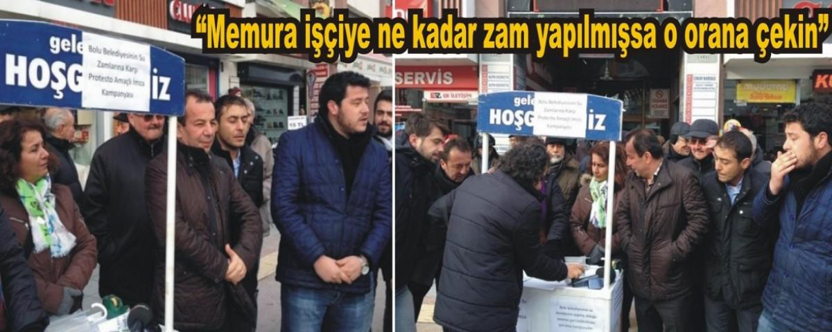 Karagöz’ün ardından konuşan CHP Bolu Milletvekili Tanju Özcan, yapılan zammın kabul edilemeyeceğini, oranın maaş zamlarına çekilmesi gerektiğini söyledi. Özcan şöyle konuştu; “Bütün halkımızın cebine büyük bir yük bindiren yaklaşık yüzde 40’lık su zammını protesto etmek için ve bu su zamlar geri alınsın diye çağrıda bulunmak üzere bu imza kampanyasını düzenleyen Cumhuriyet Halk Partisi’nin gençlik ve kadın kollarına sayın başkanlarına yöneticilerine çok teşekkür ediyorum. Sen hükümet olarak emekliye memura yüzde 3 mü 5 mi zam yapalım tartışması yapacaksın, ama en temel ihtiyaç olan suya tek kalemde yüzde 40 zam yapacaksınız. Bunun kabulü mümkün değil. Emekliye gelince para yok, ama su parası ödetmeye gelince o emekliye tek kalemde yüzde 40 zam. Bunu CHP kadın kolları ve gençlik kolları organize etmiş ama bu su zamları sadece Cumhuriyet Halk Partisi’ne oy veren yada Cumhuriyet Halk Partililere yapılmış bir zam değildir. Bu Bolu’da AKP’ye oy veren, MHP’ye, diğer siyasi partilere oy veren bütün Bolulu vatandaşlarımıza atılmış bir kazıktır, Bolu Belediyesi tarafından. Biz uzun bir süre Bolu Belediyesi’nin bu konuda geri adım atmasını bekledik. Ama maalesef bu konuda herhangi bir geri adım atma söz konusu olmadı. Bir de kurnazlık yaptılar, nasıl olsa, ilk su faturası seçimden sonra yani Ocak ayından itibaren insanlara gelecek gerekçesi ile Kasım ayından itibaren bu zammı yürürlüğe koydular. Dünyanın neresinde olursa olsun, işçiye memura yüzde 3 – 5 zam yaparken, en temel kullanım maddelerinden olan suya yüzde 40 oranında zam yapılmaz. Biz buradan açık bir çağrıda bulunuyorum. Bu imzaları kadın ve gençlik kollarımız tamamladıktan sonra arkadaşlarımız bunları belediye başkanına sunacaklar. Bolulular bu su zamlarından dolayı mağdur. Ülkenin hiçbir yerinde suya yüzde 40 zam yapıldığı görülmemiştir. Lütfen belediye başkanı olarak belediye meclisini toplayın ve bu su zammını memur ve işçi maaşlarına en son ne kadar zam verilmişse o orana geri çekin diyeceğiz. Ben bugün belediye meclis grubumuzla da görüşme yapacağım. Onlardan da şunu isteyeceğim. Seçilmiş belediye meclisi üyeleri olarak bu su zammının geri alınması ve memur ve işçi maaşlarına yapılan zamma indirilmesi noktasında bir önerge verin. Önümüzdeki hafta zannediyorum belediye meclisi toplanacak. Orada da bu konuda girişimde bulunun diyeceğiz. Bunu özellikle rica edeceğim. Bu atılan kazık tüm vatandaşlara atılan bir kazıktır. Biz hep bir şey söyleriz. Sosyal demokrat belediyecilik anlayışı ile diğer belediyecilik anlayışı arasındaki farka dikkat çekeriz. Bizim bugün su zamlarını geri al diye çağrıda bulunduğumuz Bolu Belediyesi AKP zihniyeti ile yönetiliyor. Mengen Belediyesi sosyal demokrat belediyecilik anlayışı ile yönetiliyor. Farkı ne? Seçimin üzerinden yaklaşık iki yıl geçti, Mengen Belediyesi suya hiç zam yapmadı. Keza Mudurnu Belediyesi de aynı anlayışta.”