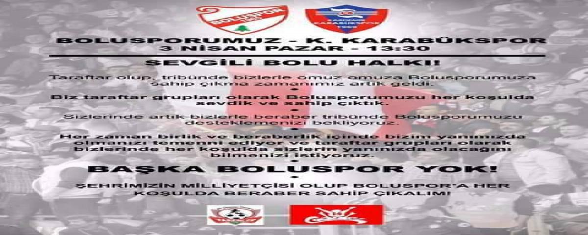 Bolulu Yarenler Derneği ve Cadde 14 taraftar gurubu, hazırladıkları görsellerle Bolu halkını tribünde omuz omuza Boluspor’u desteklemeye davet ederek; “Taraftar olup, tribünde omuz omuza Bolusporumuza sahip çıkma zamanımız geldi. Biz taraftar grupları olarak Bolusporumuzu her koşulda sevdik ve sahip çıktık. Sizlerinde artık bizlerle beraber tribünde Bolusporumuzu desteklemenizi istiyoruz. Her zaman birlik ve beraberlik içinde bizim yanımızda olmanızı temenni ediyor ve taraftar grupları olarak bizlerinde her koşulda sizlerin yanınızda olacağınızı bilmenizi istiyoruz. Başka Boluspor yok. Şehrimizin milliyetçisi olup, Boluspor’a her koşulda beraber sahip çıkalım” ifadelerine yer verdi.