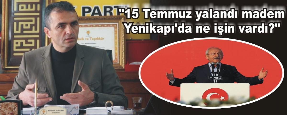 CHP Genel Başkanı Kemal Kılıçdaroğlu'nun geçtiğimiz gün yaptığı "15 Temmuz kontrollü darbeydi" açıklamasını da sert bir dille eleştiren AK Parti İl Başkanı Nurettin Doğanay; "Kılıçdaroğlu “9.30'da darbe mi olur. Onların önceden bu darbeden haberleri var. Ayrıca FETÖ'cülerin ifadeleri de kontrollü darbe olduğu kanısını güçlendiriyor. 15 Temmuz Darbesi kontrollü bir darbedir” ifadelerini kullandı. Bu 248 şehidimize hakarettir. Kılıçdaroğlu’nun söylemlerinden anlaşılan şudur: “FETÖ’cülerin ağzı ve referansıyla konuşmaktadır.” Madem 15 Temmuz Darbesi ve o gece yaşananlar yalandı; neden Yenikapı’ya geldi. Neden Cumhurbaşkanlığı Külliyesi’ne gitti? Niye her konuşmasında 15 Temmuz’a atıfla “Gazi Meclis” sözünü kullandı.