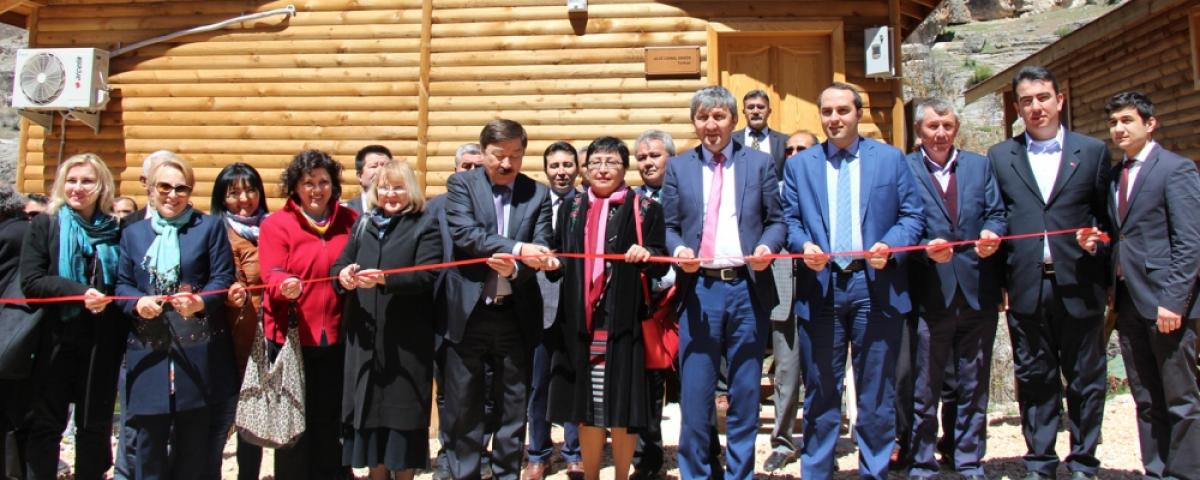 Kaseinov, kültürel ve sanatsal faaliyetlerin arttırılması için umutlu olduğunu vurguladığı konuşmasının devamında ise “Türk Dünyasına yapmış olduğu üstün hizmetler anısına TÜRKSOY onur madalyası takdim ettiğimiz “Hocaların Hocası” Profesör Doktur Halil İnalcık’ın adını taşıyan bu mekanın hayat bulması sayesinde Köroğlu’nun topraklarındaki ortak kültür ve sanatsal etkileşimimiz yeni bir ivme kazanacaktır” ifadelerini kullandı. Yapılan konuşmaların ardından protokol üyeleri tarafından kurdele kesimi yapılarak, törene katılanlarla birlikte bungalov evler dolaşıldı.