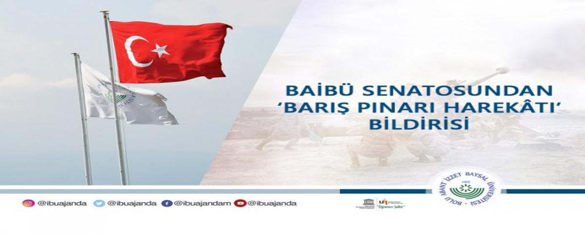 Yayınlanan bildiride, “Bolu Abant İzzet Baysal Üniversitesi Senatosu bugün (10.10.2019) yaptığı toplantıda, Barış Pınarı Harekâtı’na yönelik bildiri yayınladı. Bildiride şu ifadelere yer verildi; “Türkiye Cumhuriyeti Hükümeti, bölgesinde gelişen şartlara binaen, Türk Silahlı Kuvvetleri eliyle, 09 Ekim 2019 tarihinde Barış Pınarı Harekâtı’nı başlatmıştır.