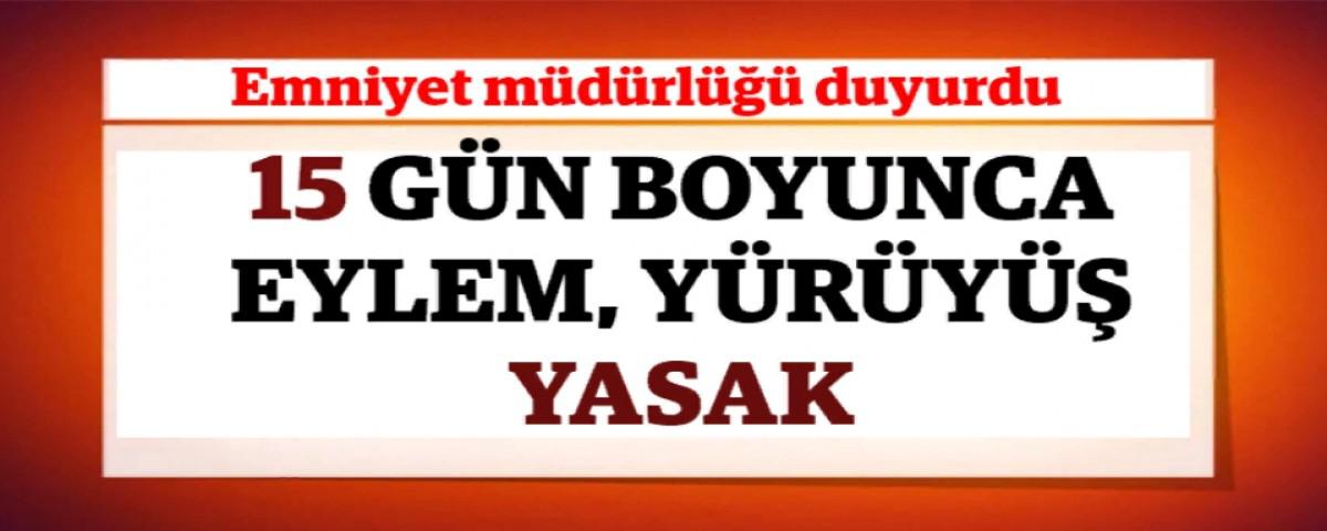 Türk Silahlı Kuvvetlerimiz tarafından başlatılan “Barış Pınarı Harekatını” protesto etmek amacıyla; ilimiz genelinde gerçekleştirilebilecek, (Devlet Kurum ve Kuruluşlarının program ve etkinlikleri, resmi bayram, resmi anma günleri, resmi tören ve kutlamalar ile bu kuramların düzenleyeceği gelenek ve göreneklere göre yapacakları programlar, spor faaliyetler ile bilimsel, ticari ve ekonomik amaçlarla yapılan toplantılar hariç olmak üzere;) açık ve kapalı yer toplantıları, yürüyüş, basın açıklaması, oturma eylemi, stant açma, çadır kurma, bildiri dağıtma, vb. eylem/etkinlikler ile bu eyleme destek vermek amacıyla eylem ve etkinlik düzenlemek için gelen araçların ve şahısların ilimiz sınırlarına girişleri, 5442 sayılı İl İdaresi Kanununun 11/C maddesi ve 2911 sayılı Toplantı ve Gösteri Yürüyüşleri Kanununun 7. ve 17. Maddeleri hükümleri gereğince, Valilik Makamının 28/10/2019 tarih ve 47388285-10175.15160/1063 sayılı yazılarına istinaden, 28/10/2019 günü saat:11.00'dan 11/11/2019 günü saat:11.00'e kadar (15) gün süre ile yasaklanmıştır.
