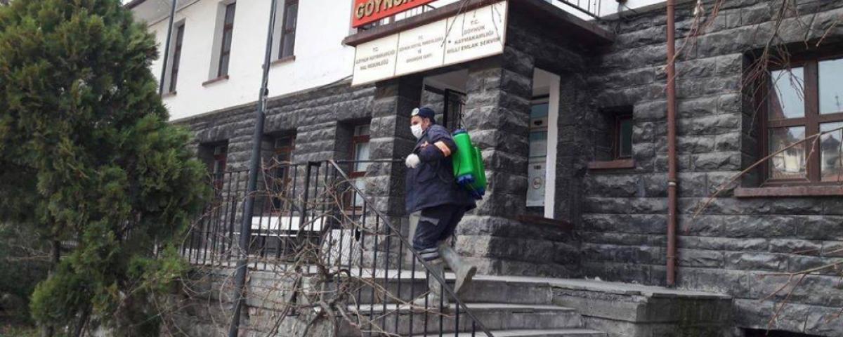 Göynük Belediye Başkanı Ahmet Çankaya'nın talimatı doğrultusunda Belediye Fen İşleri Müdürlüğü Temizlik İşleri personeli tarafından koronavirüs tedbirleri kapsamında dezenfekte çalışmaları devam ediyor. Belirli periyotlar halinde devam eden çalışmalar kapsamında ilçe merkezinde bulunan cadde ve sokakların yanı sıra kamu binaları ile çevresinde dezenfekte çalışmaları gerçekleşti