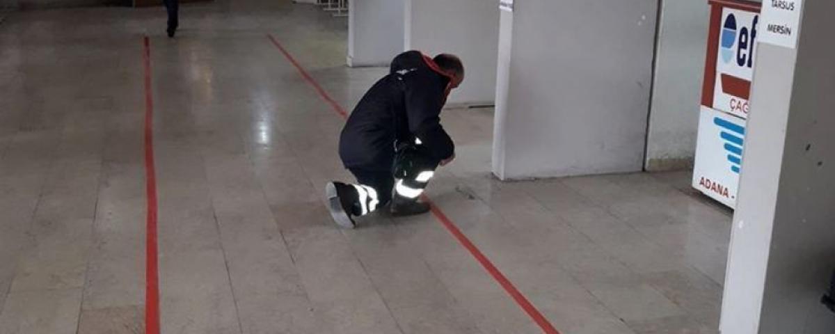 Mengen Belediyesi tarafından koronavirüse karşı işyerlerinde vatandaşların sosyal mesafeyi korumaları için kırmızı bant uygulaması hayata geçirildi.