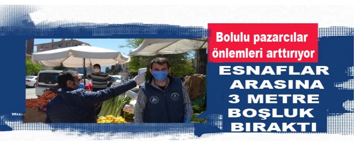 Bolu'da, korona virüs tedbirleri kapsamında pazar esnafı kendi önlemlerini alıyor. Bolu Manav ve Pazarcılar Odası tarafından alınan karar doğrultusunda esnaflar, açtıkları tezgahların arasına 3'er metrelik mesafe bırakıyor. Öte yandan Bolu Belediyesi Zabıta Müdürlüğü ekipleri ve oda yetkilileri tarafından esnafların sık sık ateş ölçümleri yapılıyor.