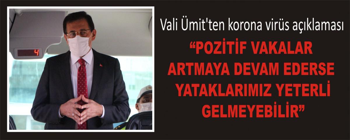Her gün pozitif vakaların olduğunu belirten Vali Ümit, “Hastaları yatıracak yatağımız var. Her gün pozitif vakalar da var. Bu pozitif vakalar böyle artmaya devam ederse yataklarımız yeterli gelmeyebilir. Şu an yatak sorunumuz yok ama yarın olmayacak diye bir konu söz konusu değil. Biz ne yapıp edip salgının önüne geçmemiz lazım. Tedbirlere ve kurallara uymamız lazım” dedi.