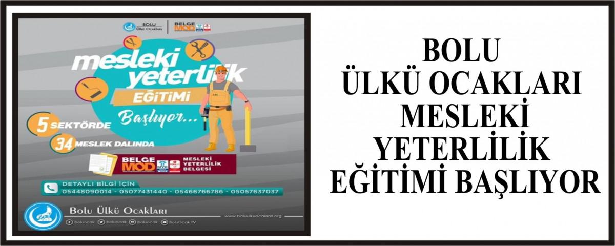 Bolu Ülkü Ocakları Mesleki Yeterlilik Eğitiminin başlıyor. Bolu Ülkü Ocakları ve Belgemod Mesleki Yeterlilik Belgelendirme ve Sınav Merkezi'nin protokolü ile ortak yapılan eğitimin kayıt 15 Ocak 2021 – 27 Ocak 2021 tarihleri arasında yapılacak. Kayıtların sonunda “Mesleki Yeterlilik Belgesi” eğitimi alan kişiler eğitim sonunda belgeyi almaya hak kazanabilecek.