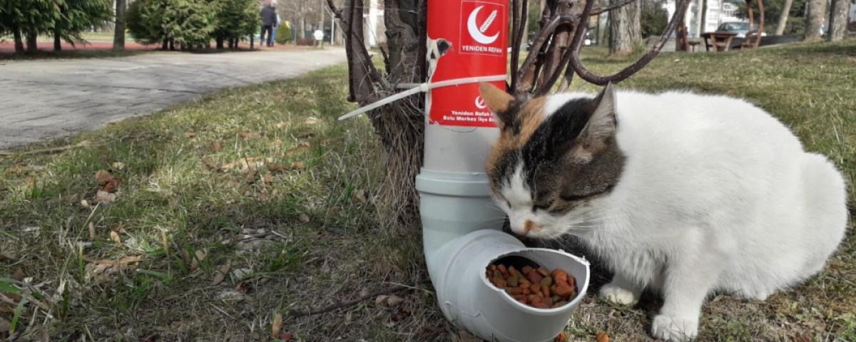 Sokak hayvanlarının olumsuz hava koşullarından asgari seviyede etkilenmesini amaçlayan Yeniden Refah Partililer, mama aparatlarını oluşturmak için atıl durumda olan plastik su borularını kullandı.