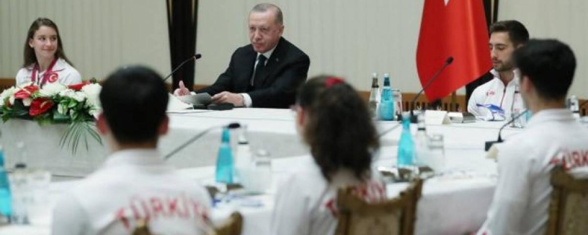 Cumhurbaşkanlığı Külliyesi'ne, sporcuları ağırlamaktan memnuniyet duyduğunu dile getiren Erdoğan, “Aerobik Cimnastik Dünya Şampiyonası'nda birinci olan Ayşe Begüm evladımızı sizler adına en son şampiyonumuz olması hasebiyle kutluyorum. Uluslararası müsabakalarda ülkemizi başarıyla temsil eden siz cimnastikçilerimizi yine şahsım ve milletim adına tebrik ediyorum. Rabbimden başarılarınızın katlanarak devam etmesini niyaz ediyorum” dedi.
