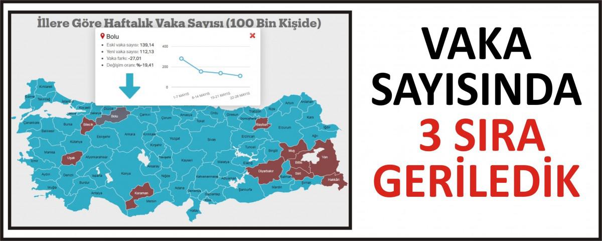 Sağlık Bakanı Fahrettin Koca, illere göre 100 bin nüfustaki vaka sayısını içeren haritayı paylaştı. Haritaya göre ülkemiz genelinde vaka sayılarında önemli bir düşüş kaydedildi. Bakan Koca tarafından açıklanan haritaya göre ilimizde 100 bin nüfusta 15-21 Mayıs haftasında 139,14 olan vaka sayısı 22-28 Mayıs haftasında bekleneni vermedi. 22-28 Mayıs haftası haritasına göre ilimiz Bolu'da 100 bin nüfustaki vaka sayısı 112,13 olarak gerçekleşti. Son açıklanan haftalık vaka sayısına göre ayrıca ilimiz Bolu ülkemizde 100 bin nüfustaki haftalık vaka sayısının en yüksek olduğu 6. il oldu. Birinci sırayı 162,31 ile Gümüşhane alırken ikinci sırayı 146,76 ile Bilecik, üçüncü sırayı 118,63 ile Kars, dördüncü sırayı 115,71 ile Ankara, beşinci sırayı 112,71 ile Kütahya aldı.