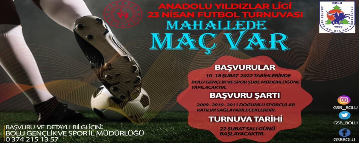 2021-2022 sezonu Anadolu Yıldızlar Ligi bünyesinde yapılacak olan “23 Nisan Futbol Turnuvası: Mahallede Maç Var” organizasyonu , 14 Şubat – 08 Mart 2022 tarihleri arasında Gençlik ve Spor İl Müdürlükleri, Amatör Spor Kulüpleri Federasyonu (ASKF) İl Temsilcilikleri ve Futbol İl Temsilcilikleri (FİT) koordinasyonunda yapılacak.