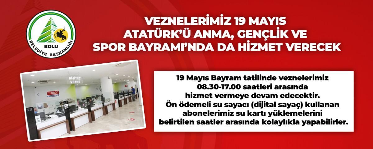 19 Mayıs Atatürk'ü Anma, Gençlik ve Spor Bayramı'nda Bolu Belediyesi'nde vatandaşların mağdur olmamaları için vezneler hizmet vermeye devam edecek. Hizmetlerin aksamaması için Bolu Belediyesi 1 günlük resmi tatilde vezneleri açık tutacak. Açık olan veznelerden emlak vergisi ödemeleri, dijital su kartı yüklemeleri, su faturası ödemeleri ve diğer işlemler kolaylıkla yapılabilecek.