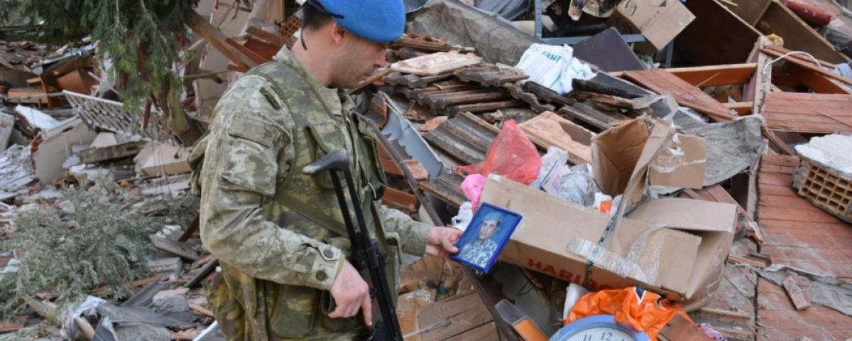 Asayişi sağlamak için Hatay'da devriye atan Bolu 2'nci Dağ Komando Tugayında görevli bir asker enkaz altında, kendi birliğine mensup, başka bir komandonun fotoğrafıyla karşılaştı. Milli Savunma Bakanlığının sosyal medya hesabından o anın fotoğrafı paylaşıldı.