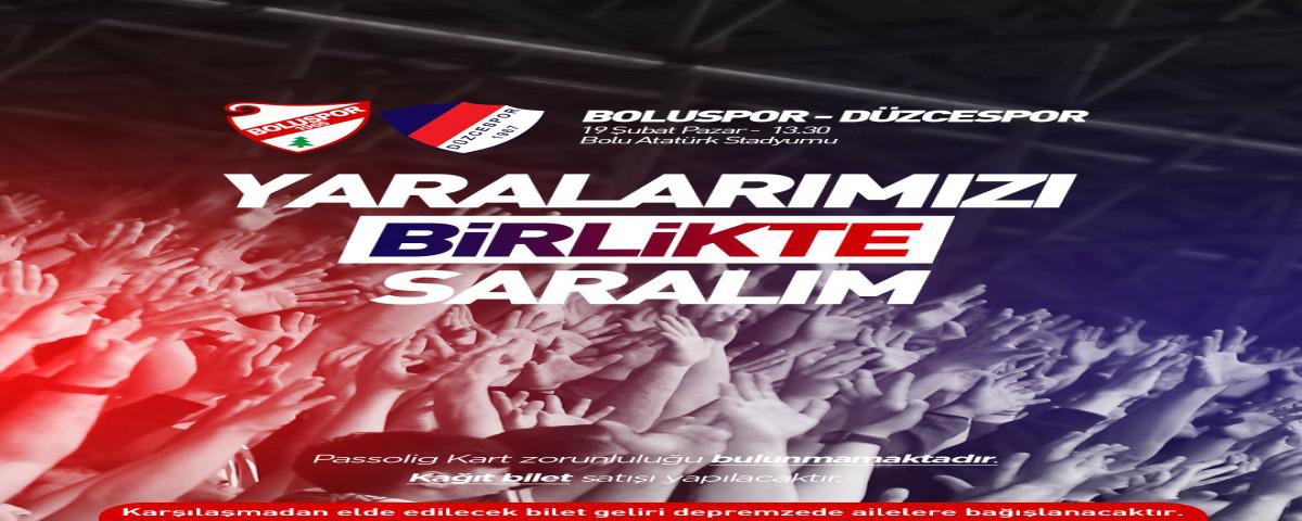 Depremin yaralarını sarmak amacıyla, bilet gelirleri tamamen depremzede vatandaşlarımıza bağışlanmak üzere DyorEXBoluspor – Düzce Cam Düzcespor arasında 19 Şubat Pazar günü saat 13.30'da Bolu Atatürk Stadyumu'nda hazırlık maçı oynanacaktır.