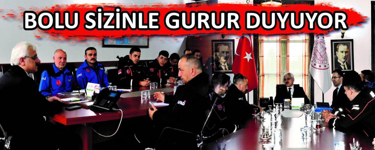 Bolu Valisi Erkan Kılıç, 26 Şubat'ta Hatay'dan dönen 19 kişilik Bolu AFAD arama-kurtarma ekibi ile bir araya geldi. Kılıç, arama-kurtarma ekibinin canla başla yardıma koştuğunu vurgulayarak “Bolu sizinle gurur duyuyor” dedi.