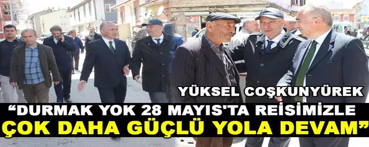 AK Parti Bolu Milletvekili Yüksel Coşkunyürek, 14 Mayıs'ta gerçekleşen seçimin ardından teşekkür ziyaretlerine Yeniçağa ilçesinde devam etti. Yeniçağa Belediye Başkanı Recayi Çağlar, Coşkunyürek'e eşlik etti. Yeniçağa ilçesinde esnafları ziyaret ederek teşekkür ziyaretleri gerçekleştiren Coşkunyürek, sokakta karşılaştığı vatandaşlarla selamlaştı. Coşkunyürek vatandaştan 28 Mayıs'ta yapılacak ikinci tur seçimleri için Cumhurbaşkanı ve AK Parti Genel başkanı Recep Tayyip Erdoğan'a destek istedi.