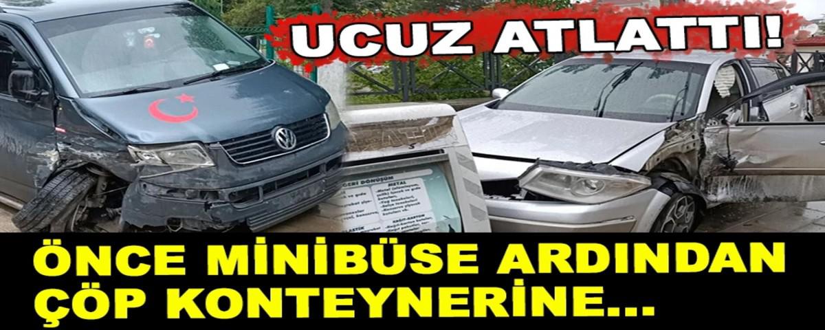 Bolu'da seyir halindeki bir otomobil önce minibüs ile çarpıştı. Kazanın ardından savrulan otomobil daha sonra çöp konteynerlerine çarparak durabildi.