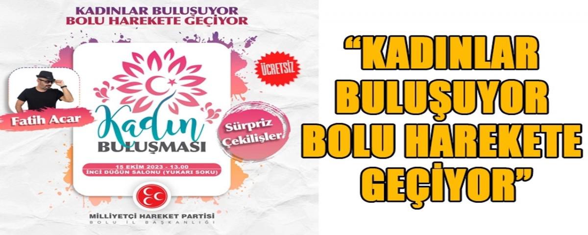 Daha önce yapmış olduğu farkındalık projeleri ile insanların gönlünde taht kuran Milliyetçi Hareket Partisi Bolu İl Başkanlığı kadınları unutmadı. “Kadınlar Buluşuyor Bolu Harekete Geçiyor” diyerek kadınlara yönelik eğlence programı hazırladı. 15 Ekim Pazar günü İnci Düğün Salonu'nda gerçekleştirilecek ve ücretsiz olan eğlencede Bolu'nun sevilen sanatçılarından Fatih Acar sahne alacak. Ayrıca bu eğlencede sürpriz çekilişler olacak. Bolulu tüm kadınları bu eğlenceye davet eden MHP KAÇEP Bolu İl Başkanı Sema Gülen “Eşiniz, kız kardeşiniz, arkadaşlarınız ve hayatınızın her alanında yer alan değerli kadınlarımız için hazırladığımız “Kadınlar Buluşuyor Bolu Harekete Geçiyor” Kadın Buluşması etkinliğimize tüm hanımefendileri bekliyoruz” dedi.
