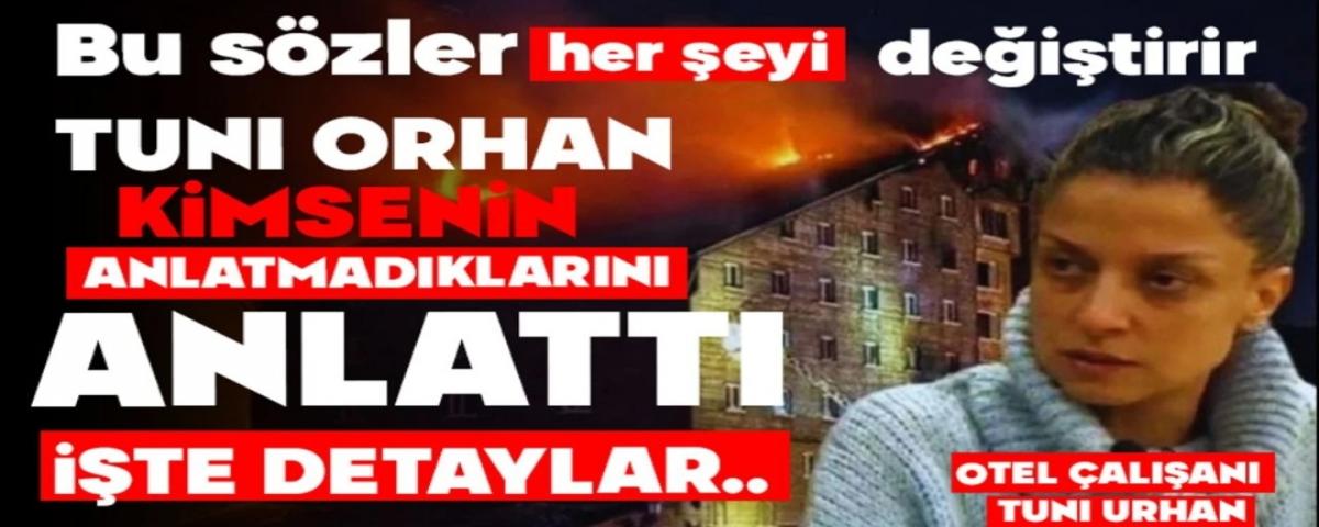 Otelde odalarda bulunan mini barlardan sorumlu olan Tuni Urhan ise otel müdürü Zeki Yılmaz'ın yangının başladığı anlarda 'Kimseye haber vermeyin kendi aramızda halledelim" şeklinde konuşmalar duyduğunu iddia ederek, "9 ile 12 inci katların içeceklerinden sorumluydum. Olay gecesi kayak odasının olduğu katta kalıyordum. Babamda çamaşırhane de çalışıyorduBir süre sonra babamla buluştuk ve otelin ön tarafına geçtik. Otelden dışarı çıktığımda saat 03,00'a geliyordu. Yangın alarmı duymadım, yangın tüpü, yağmurlama sistemi görmedim. Yangın eğitimi verilmedi, tatbikat yapılmadı. İş güvenliği uzmanı bildiğim kadarıyla yoktu. Odalarda sigara içildiği için yangın detektörlerinin kapatıldığını duydum. Beni Kadir Özdemir işe aldı. Ön tarafa çıktığımda bir kaç kişi vardı.Personel arasında Zeki bey kimseye haber vermeyin kendi aramızda halledelim dediği konuşuluyordu. Zeki beyin bir kaç personeli de garaja gönderdiğini duydum." diye konuştu.