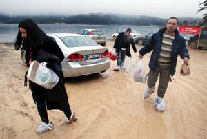 Yetkililerin önlem almamasına tepki gösteren tatilciler, ayaklarına taktıkları poşetlerle çamurdan korunmaya çalıştı.