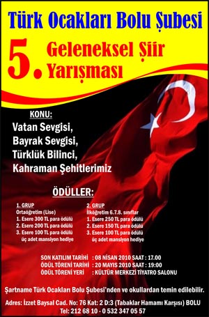 Türk Ocakları Bolu Şubesi, 5.Geleneksel Şiir Yarışmasını düzenliyor. Yarışma ?Vatan sevgisi?, ?Bayrak sevgisi?, ?Türklük bilinci? ve ?Kahraman şehitlerimiz? den oluşuyor.