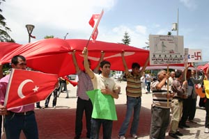 İsrail?in Gazze?ye giden yardım gemilerine saldırmasına yönelik tepkiler sürüyor. Hükümet Meydanı?nda toplanan yaklaşık 300 kişilik grup, ?Kahrolsun İsrail?, ?Filistin İsrail?e mezar olacak?, ?O denizde bir gün boğarız sizi? pankartları açtı. Kur?an-ı Kerim okunduktan sonra grup, ellerinde dev Türk Bayrağı, Filistin bayrakları, dövizlerle slogan atarak İzzet Baysal Caddesi?nden Belediye Meydanı?na kadar yürüdü.