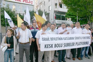 SES Bolu Şube Başkanı ve KESK Dönem Sözcüsü Serdar Koçyiğit tarafından okunan basın açıklamasında, ?Yapılan operasyonun en temel insani değerleri bile çiğnemeyi göze alan, katliamları, öldürmeyi bir politika olarak gören İsrail Hükümeti?nin tarihe yazdığı bir utanç sayfası olarak görüyoruz. Gemilerden teknik olarak haber alınamıyor olması Mavi Marmara dışındaki gemilere de operasyon yapılıyor olabileceği ve 9 olarak açıklanan ölü sayısının artabileceği endişelerimizi arttırmaktadır. İsrail sivilleri hedef alarak, insan hayatına kayıtsızlığını ve barışçı girişimlere yönelik tahammülsüzlüğünü bir kez daha kanıtlamıştır. İsrail?in bu insanlık dışı uygulamalarını şiddetle kınıyoruz? ifadeleri kullanıldı.