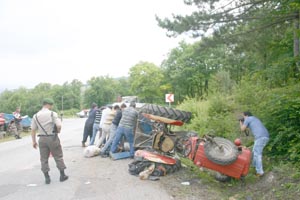 Aladağlar bölgesinde gerçekleştirilen kesim çalışmalarından dönen Nazmi Özdemir'in (46) kullandığı 14 AK 647 plakalı traktör Emen Köyü mevkiinde belirlenemeyen nedenden dolayı takla attı. Kazada yaralanan traktör sürücüsü Nazmi Özdemir olay yerine gelen sağlık ekipleri tarafından Bolu Köroğlu Devlet Hastanesine kaldırıldı. Özcan?ın sağlık durumunun iyi olduğu öğrenildi. Kazayı duyan Özdemir?in yakınları ise takla atan traktörü kaldırmaya çalıştı. Ulaşım bir süre kontrollü olarak sağlandı.