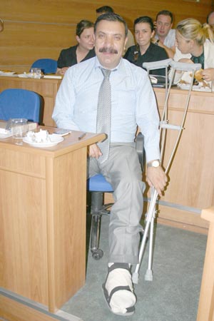 Ayağı iki kırık nedeniyle alçıya alınan Belediye İmar Müdürü Yaşar Taşkıran, raporlu olmasına rağmen çalışmalarını aksatmıyor. Alçılı ayakla dışarıda çalışmalarına devam eden Taşkıran, önceki gün gerçekleştirilen Belediye Meclisinin Temmuz toplantılarının ilkine de katılmayı ihmal etmedi. Taşkıran, koltuk değnekleri yardımıyla katıldığı toplantıda imar konusunda ki gündem maddelerine alçıya rağmen ayağa kalkarak cevap verdi.