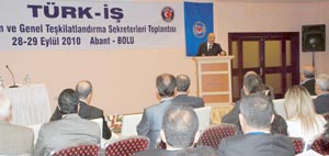 Türk-İş Genel Eğitim ve Genel Teşkilatlandırma Sekreterleri Toplantısı Bolu Abant Palace Otel?de yapıldı. Toplantının açılışında konuşan Türk-İş Genel Başkanı Mustafa Kumlu, içlerinde siyasi partilere gönül veren insanların olacağını belirterek; ?Biz de bu ülkede yaşıyoruz ve ülkenin siyasi atmosferinden sizler kadar biz de etkileniyoruz. Ama biz görevlerimize seçildiğimiz gün ister CHP?li, ister AK Partili, ister MHP?li olalım tüm siyasi gömleklerimizi sadece seçim günü giymek üzere bir kenara bıraktık. Gerek bizim içimizdeki kimi sendika başkanlarının, gerekse Başbakan ile hükümet üyelerinin çok eleştirdiği o referandum tavrını da kurumsal olarak sırtımızda hiçbir siyasi partinin gömleğini taşımadığımız için alabildik? dedi.