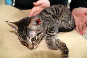 İzzet Baysal Akıl ve Ruh Sağlığı Hastanesi?nde çalışan Yıldız Aslan, dün sabah işe gitmek için Bahçelievler Mahallesi?ndeki evinden ayrıldı. Gece nöbet tutan Yıldız Aslan, bu sabah eve geldiğinde ?Süslü? adlı 2 aylık kedisini yerde hareketsiz yatarken buldu. Kediye mama veren Yıldız Aslan, daha sonra kedisinin yürüyemediğini ve sol kulağının kopmuş olduğunu görünce gözlerine inanamadı. Yıldız Aslan kedisini hemen battaniyeye sardı ve soluğu veterinerde aldı. Yapılan muayenede yavru kedinin ayaklarının titrediği görülürken, sol ön ve sağ arka bacağının kırık, sol kulağının üst kısmının kopartılmış olduğu belirlendi. Aslan, kedisinin tedavisi sırasında gözyaşlarına boğuldu.