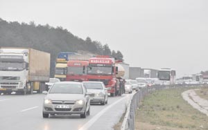 Bolu Tem Otoyolu?nun İstanbul istikametinde orta şeritte arıza yapan bir tır, trafiği sıkıştırdı. Yolda, kilometrelerce kuyruk oluştu.