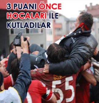 Bolusporlu oyuncular kazanılan Karşıyaka maçının ardından Teknik Direktör Levent Eriş’i omuzlarına alarak galibiyetin sevincini yaşadılar.