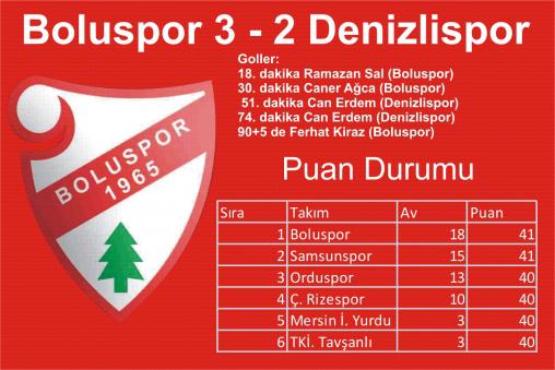 Denizlisporun ikinci golünden sonra tekrar oyun disiplinini ele alan Boluspor ataklarını yoğunlaştırmaya başladı. Peşpeşe Denizlispor kalesini yoklayan Boluspor maçın son dakikasında 90+5'te Ferhat Kiraz'ın Denizlispor kalesinin solundan yaptığı asisti muhteşem bir vuruşla sonlandırınca meşin yuvarlak Denizlispor fileleriyle üçüncü kez buluştu. Bu gol aynı zamanda maçın skorunu da belirledi.