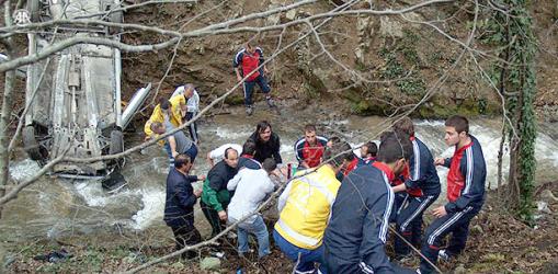 1 kişinin öldüğü, 3 kişinin yaralandığı kazadaki kurtarma çalışmalarını futbolcular cep telefonlarıyla görüntüledi. Cemal Yardım yönetimindeki 67 ES 984 plakalı otomobil, Devrek- Mengen karayolunda yaklaşık 10 metrelik uçurumdan dereye uçtu. Bölgesel Amatör Lig takımlarından Zonguldakspor kafilesi, deplasman maçından dönüş yolunda seyir halindeyken kazayı görmeleri üzerine kazazedelere yardım etmek amacıyla otobüsten indiler. Kendi çabasıyla ters dönen araçtan yaralı çıkan sürücü yola çıkarak yardım istedi. Yoldan geçmekte olan Zonguldakspor kafilesini durduran yaralı sürücü dereye uçan otomobilde 3 kişinin sıkıştığını söyledi. Durumu öğrenen futbolcular ve teknik heyet, uçurumdan inerek otomobildeki Nihal Yurtbay ve Mahir Yardım'ı kurtardı. Dik yamaçta buldukları uzun ağaç dallarının yardımıyla yaralıları yola çıkaran futbolcular, araçta sıkışan Rakibe Yardım'ı (82) da kaza yerine gelen 112 Acil Servis ekibinin yardımıyla çıkarmayı başardı.