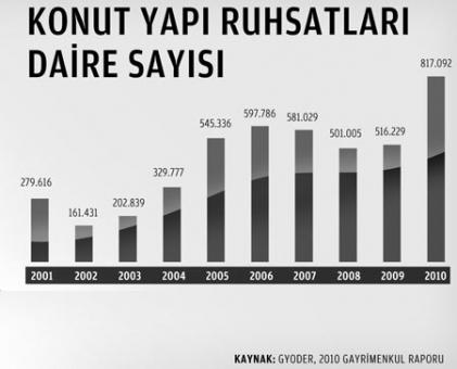 Yeni inşasına başlanan konut sayısında patlama yaşanıyor. 2010 yılında 817 bin 92 adet konut için yapı ruhsatı alındı. Böylece yeni ev yapımı sayısı Türkiye tarihinin en yüksek seviyesine ulaştı. İnşaatçının 'altın yılımız' dediği 2006'daki 597 bin adetlik rekoru geride kaldı. GYODER Başkanı Işık, "Bu hızla inşaatın 2011 yılı büyüme rakamı yüzde 10-15'i bulur." dedi. Yapımına yeni başlanan konut sayısında 2010 yılının son 4 ayından itibaren büyük bir artış yaşanıyor. Konutta büyük hareketliliğin olduğu son on yılda en yüksek yeni ev inşaatının başlandığı sene 2010 oldu. Türkiye'de markalı konut üreticilerinin üyesi olduğu Gayrimenkul Yatırım Ortaklığı Derneği (GYODER), 2010 yılında 817 bin 92 adet konut yapı ruhsatı alındığını, bunun 341 bin 31 adedinin yılın son çeyreğine ait olduğunu açıkladı. Yapı ruhsatı, müstakil veya apartman dairesi şeklinde yeni inşasına başlanan ev sayısını gösteriyor. İnşaatçıların 'patlama yaşadığımız altın yıl' dediği 2006'daki yapı ruhsatı sayısı 597 bin 786 adet idi. 2010 yılında inşasına başlanan konut sayısı, 2006 yılının dahi 220 bin adet üzerinde gerçekleşti.