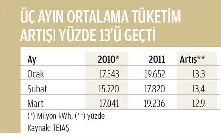 Aylık tüketim 19 milyar kilovatsaate çıkarken Enerji yönetimi, artışa rağmen herhangi bir kesintinin söz konusu olmadığı bilgisini verdi. Ekonomideki iyileşme ve sanayi üretimindeki artış, elektrik tüketimini patlattı. Türkiye Elektrik İletim AŞ (TEİAŞ) verilerine göre Mart 2011 elektrik tüketimi, geçen yılın aynı dönemine göre yüzde 12,9 oranında arttı. Aylık tüketim 17 milyar kilovatsaatten (kWh) 19,2 milyar kWh'e çıktı. Yılın ilk üç ayındaki tüketim artış ortalaması ise yüzde 13,2 oldu. Elektrik tüketimi, uzun bir aradan sonra 3 ay peş peşe çift haneli rakamlarla artış rekoru kırıyor. Elektrik tüketimindeki artışa rağmen, üretimde doğalgazın ağırlığı da devam ediyor. Geçen yıl barajlara ağırlık verilmesiyle yüzde 40'lara gerileyen doğalgazdan elektrik üretimi, tüketimdeki artışla birlikte yeniden yüzde 50'ye çıktı. Şubat 2011'de üretilen elektriğin yüzde 49,5'i doğalgazla, yüzde 17,5'i linyit ve yüzde 17,4'ü de hidrolik kaynaklardan üretildi. Geri kalan üretim ise ithal kömür, rüzgâr, fuel-oil ve jeotermal gibi kaynaklardan elde edildi.